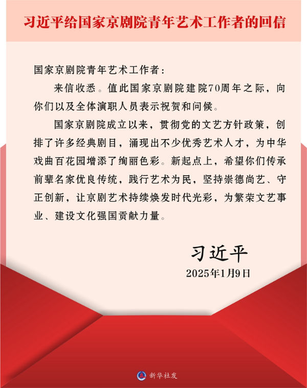 习近平在回信中说,国家京剧院成立以来,贯彻党的文艺方针政策,创排了许多经典剧目,涌现出不少优秀艺术人才,为中华戏曲百花园增添了绚丽色彩。新起点上,希望你们传承前辈名家优良传统,践行艺术为民,坚持崇德尚艺、守正创新,让京剧艺术持续焕发时代光彩,为繁荣文艺事业、建设文化强国贡献力量。