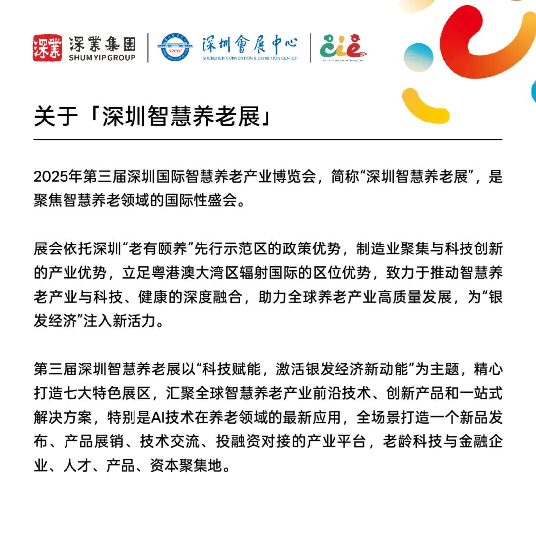 本届展会由深圳市民政局指导,深圳市幸福健康产业(集团)有限公司、深圳会展中心管理有限责任公司主办,市长青老龄大学参与协办。展会以“科技赋能,激活银发经济新动能”为主题,采取“政府引导+市场运作”的创新机制,成功打造了一个集国际化、专业化与产业化于一体的高端交流平台,全面呈现智慧养老领域的最前沿科技成果与未来趋势。